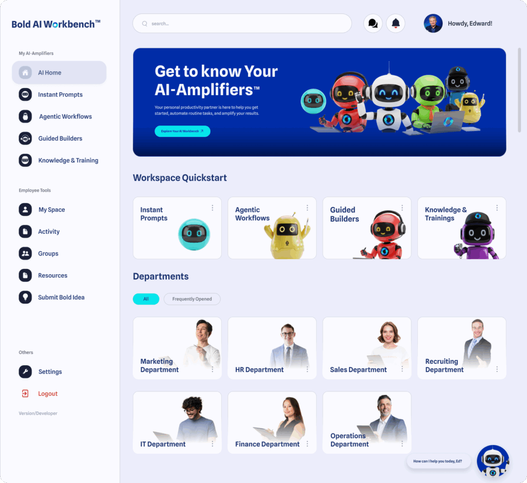 Behind every AI-Amplified™ associate is the Bold AI Workbench, our internal platform for developing, testing, and refining AI proprietary workflows aligned to real job roles.